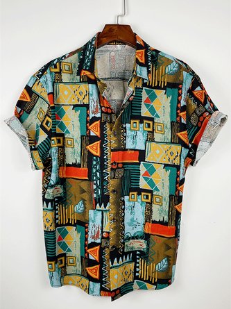 Geometric Stripes Contrast Color Chest Pocket Short Sleeve Casual Shirt