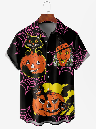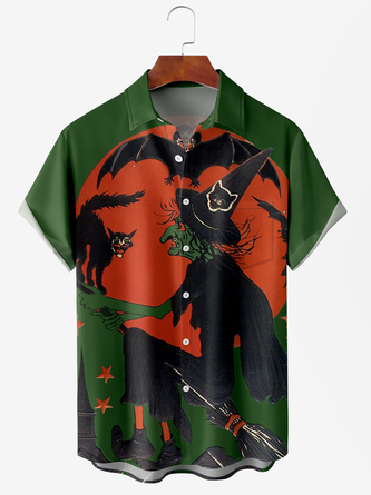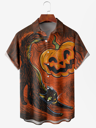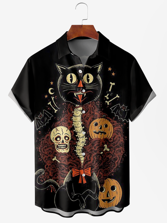 Halloween Cat Chest Pocket Short Sleeve Casual Shirt