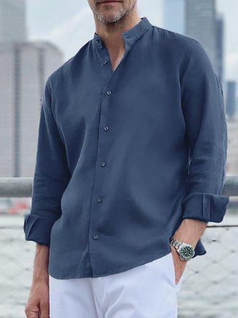 Mens Stand Collar Cotton Linen Long Sleeve Shirt