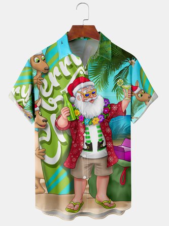 Mens Christmas Print Short Sleeve Shirt Lapel Pocket Hawaiian Shirt