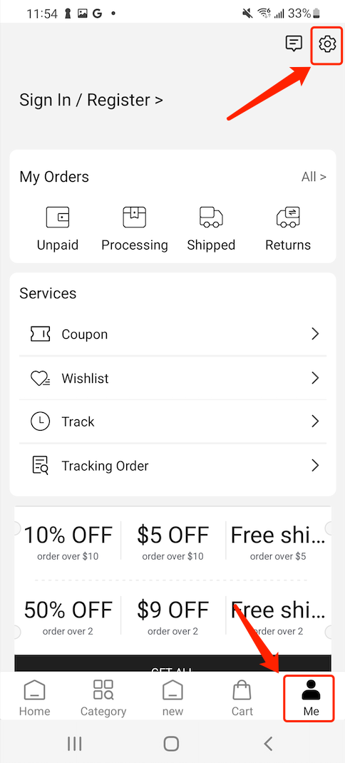 Step 1:Scroll to page "Me" and select "Setting"icon