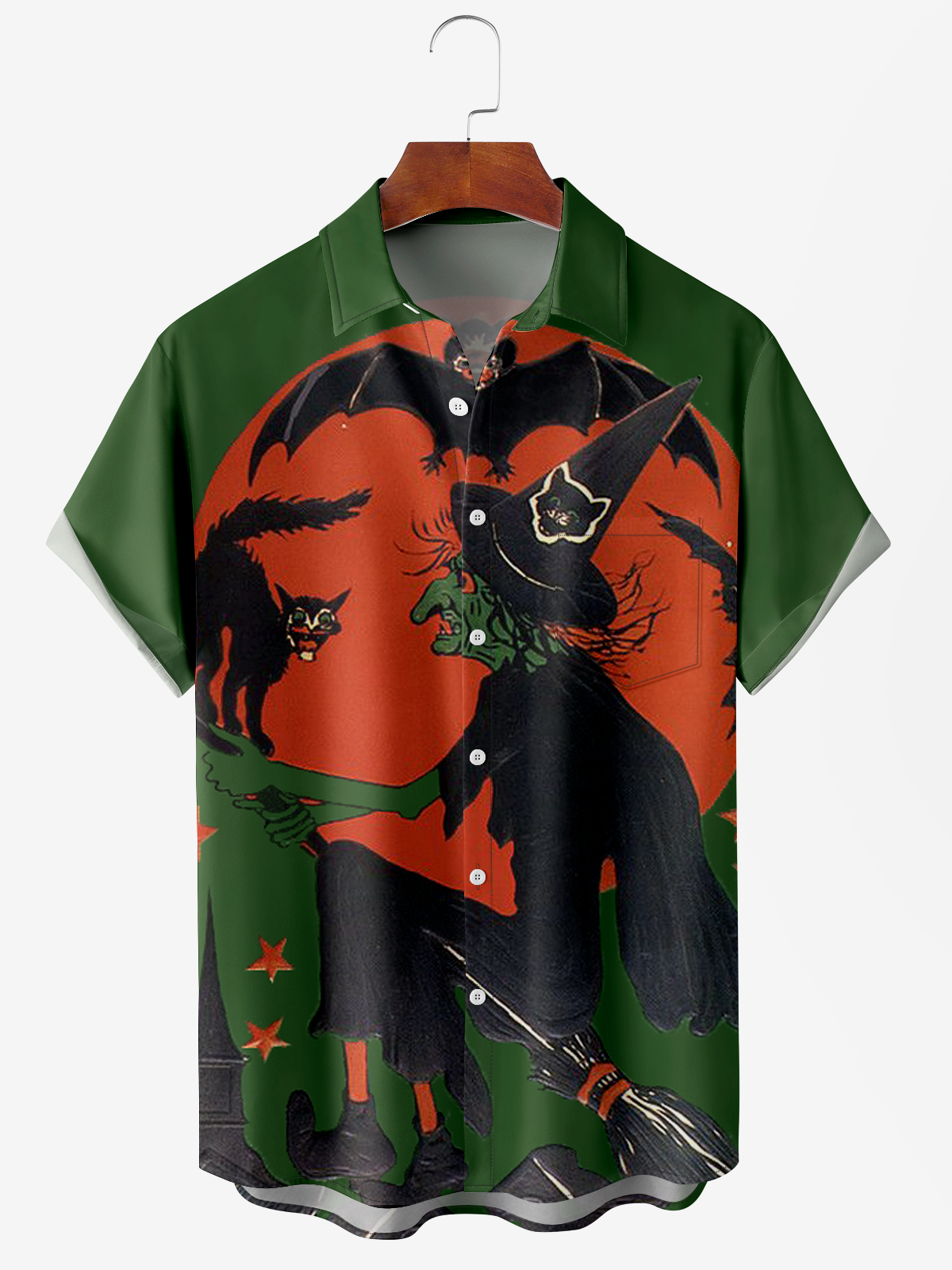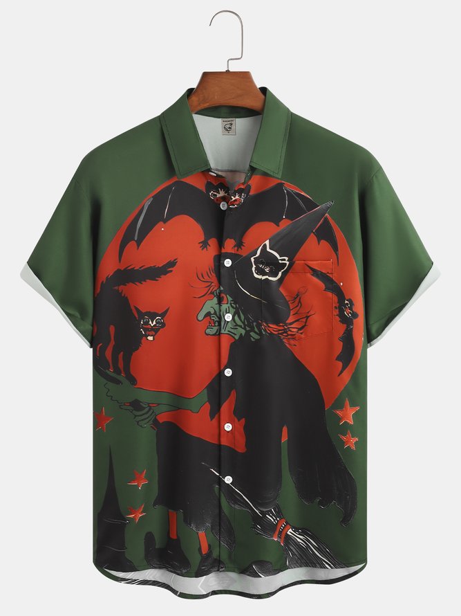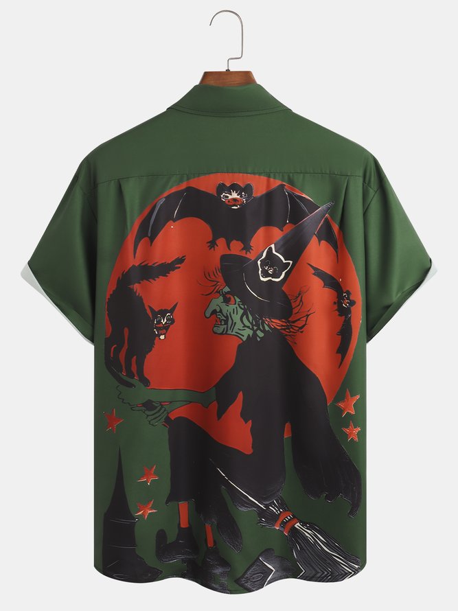Men's Halloween Witch Pumpkin Print Moisture Wicking Fabric Fashion Lapel Short Sleeve Shirt