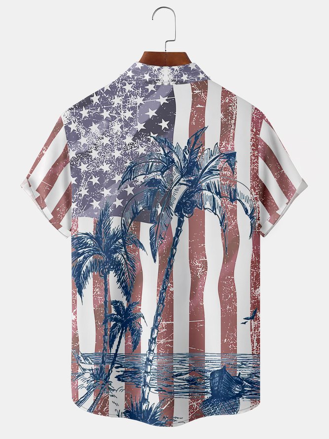 American Flag Coconut Tree Chest Pocket Short Sleeve Hawaiian Shirt