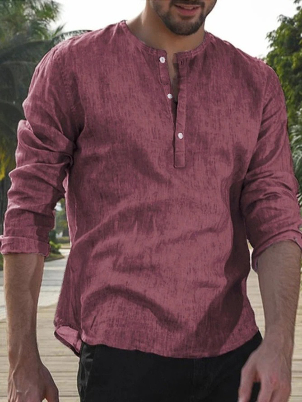 Men's Pure Color linen long-Sleeved Casual Tie Buckle A Simple V-Neck Shirt
